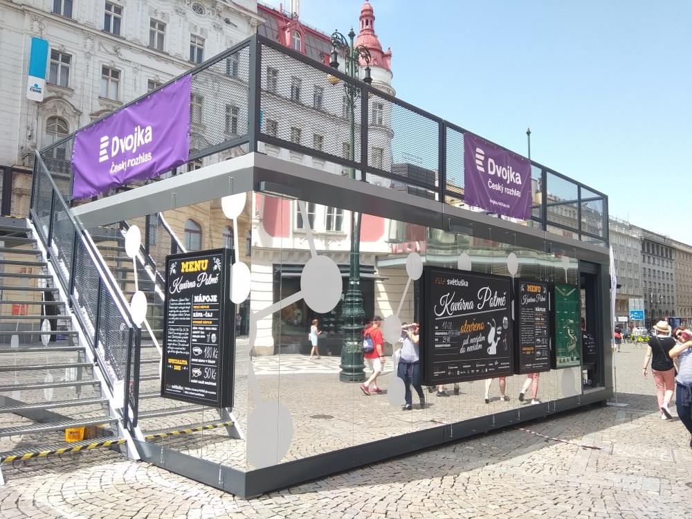 Putovní kavárna má letos podobu kostky obložené zrcadly a v tropickém dni se před obchodním centrem Palladium leskne, až vidícím kolemjdoucím přechází zrak. Trochu se obávám, že uvnitř bude nepříjemné dusno, a očividně nejsem sám. Přítelkyně na mě kouká jako na pitomce – v jejím rodném Madridu by nikoho nenapadlo postavit něco takového, ať už je to cokoli, na nestíněném náměstí. Naštěstí je v Potmě opravdu dobrá klimatizace, jak brzy poznáme na vlastní kůži.