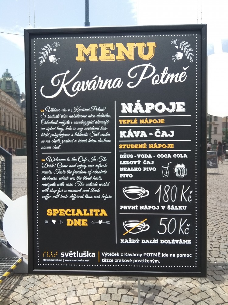 V Potmě jsme nakonec vydrželi hodinu a ostatní hosté se kolem nás stihli vystřídat. Personál kavárny vše hravě zvládal a přišlo mi, že by svedli obsloužit i větší prostor. Přestože bych si troufl najít východ sám, protože k němu byl náš stůl nejblíže, způsobně jsem zavolal na slečnu Kateřinu a poprosil ji, ať nás vyvede ven. Tam nám portýr spočítal zbylé žetonky a zaplatili jsme. Jedinou vadou na kráse je, že jsme platili vidícím brigádnicím. Nevidomí by podle svých slov vše zvládli vyřídit sami, jednotlivé mince a bankovky od sebe obvykle rozpoznají a platební terminály se vyrábí také s tlačítky označenými Braillovým písmem. Tak třeba příští rok.