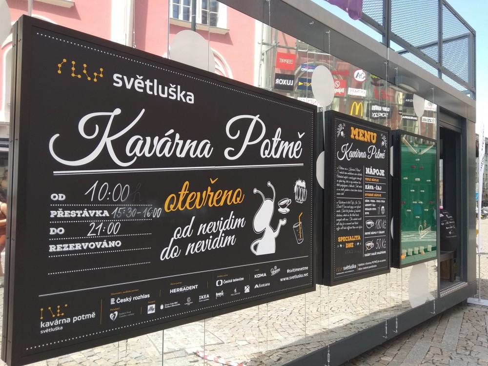 Českému čtenáři asi není třeba kavárnu Potmě představovat, většina z nás o ní už slyšela nebo četla. Projekt financuje Nadační fond Českého rozhlasu a jeho tváří se stala Aneta Langerová. Veřejnoprávní rozhlas se spolu s dalšími médii stará také o publicitu. Jméno není jen symbolické, uvnitř je opravdu naprostá tma. Hosty obsluhují nevidomí, pro které pochopitelně není orientace v prostoru beze světla o nic těžší než kdekoli jinde.