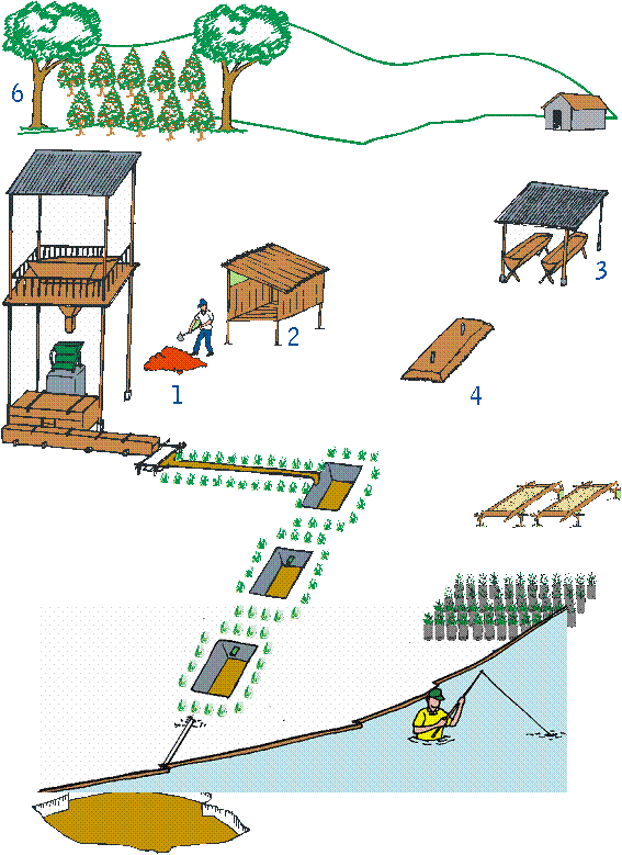 The resulting, dirty, water is led to 3 cascading basins. From the first he collects some to use as insecticide. Each tank filters the “agua miel” (honey water) a bit more and, just to show off to his neighbors, he dug a 4th hole where he started to keep fishes before leading the remaining water to the river. He is not going to pollute the small river that gives life to this mountain and everybody beyond.