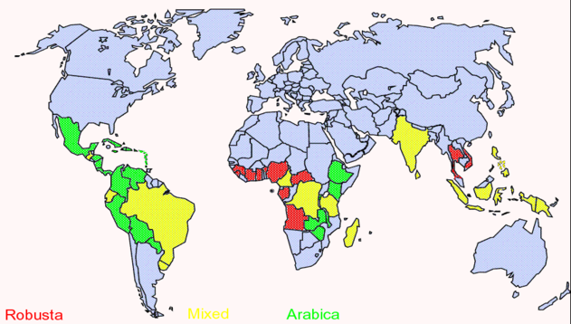 World distribution of Arabica and Robusta coffee plants. Originally introduced in the 15th century and first grown in Ethiopia, coffee is now grown in over 70 countries throughout the tropics, the area of the planet between the Tropics of Cancer and Capricorn.