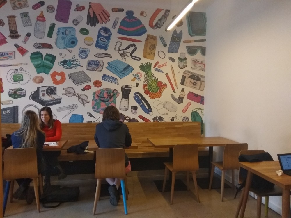 Náš stůl pro dva je u velké zdi s kresbami všeho, co stárnoucí hipster s malými dětmi potřebuje k životu, takový hispter starter kit pro věkem pokročilé. Ale abych jen nekritizoval, rozhodně musím vyzdvihnout, že všichni baristé o kávě opravdu vědí hodně, a přestože je kavárna téměř plná a obsluha se musí otáčet, vždy ochotně a fundovaně zodpoví všechny otázky hostů a poradí také s výběrem nápoje, a to i v angličtině. Pravda, do Místa chodí cizinci, třebas v Praze žijící, často, ale podobná jazyková vybavenost personálu jiných kaváren leckdy chybí.