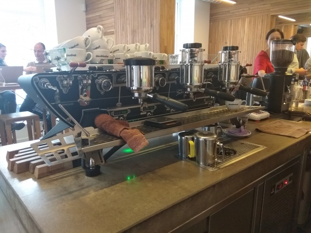 Vzhledem k modernímu a designovému interiéru Místa a celkovému konceptu kavárny ale možná překvapí, že Doubleshot používá šedesátiletou pražičku Probat UG22 a o novém modelu ani nepřemýšlí. Pražiči na ní prý nedají dopustit, jde o časem prověřenou kvalitu.
